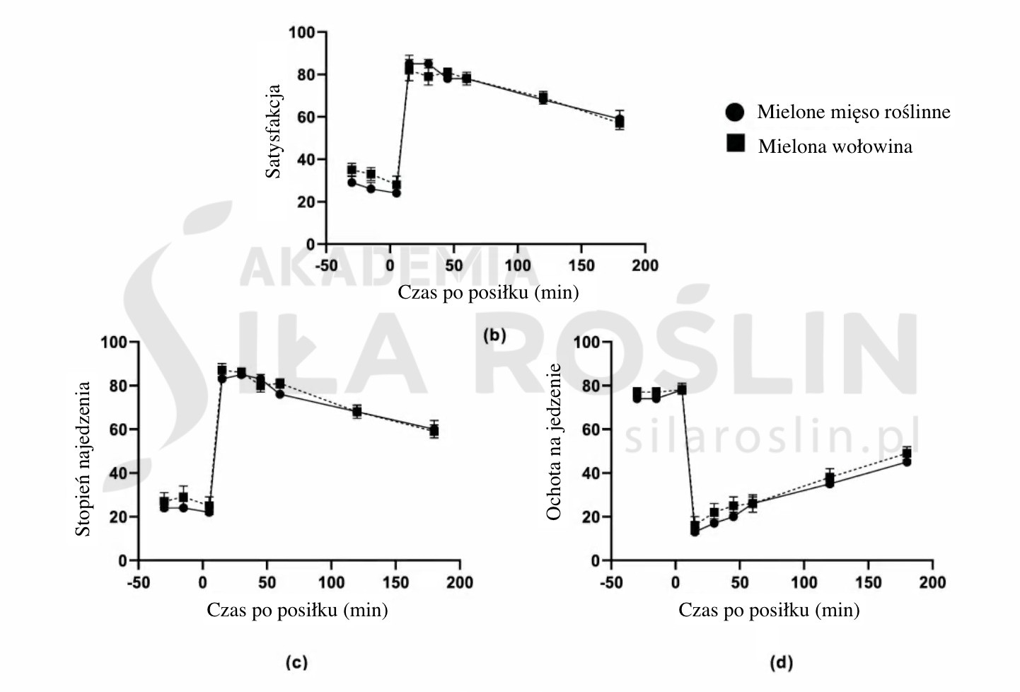 To teraz jeszcze pytanie najistotniejsze: czy wzrost poziomu GLP-1 i uczucia sytości przekłada się na faktyczną redukcję spożywanego jedzenia? W badaniu z 2022 r. [6] uczestnikom podano lunch w formie bufetu „jesz, ile chcesz”, serwując makaron z mielonym mięsem roślinnym lub mieloną wołowiną. Okazało się, że badani, którym przypadł makaron z roślinnym zamiennikiem mięsa, spożyli znacznie mniej kalorii [6]. Jednocześnie czuli się równie usatysfakcjonowani, najedzeni i syci co grupa po posiłku mięsnym (Wykres b, c, d) [6].