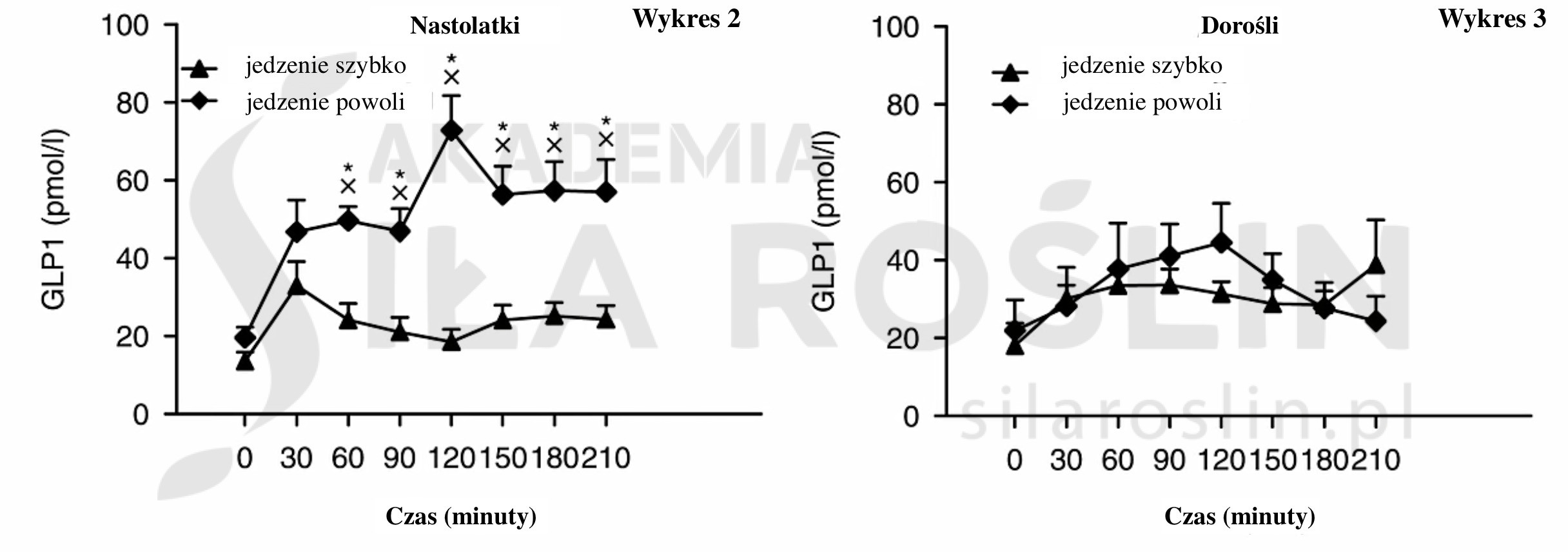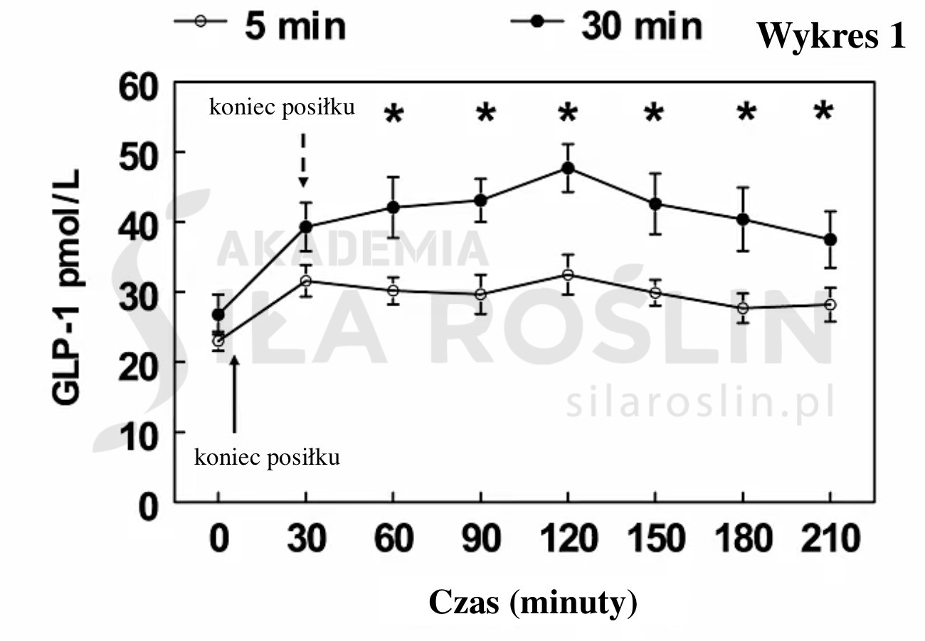 W badaniu z 2010 r. [3] wszyscy uczestnicy zjedli dokładnie taką samą porcję lodów (675 kcal), z tym że jedna grupa w ciągu 5 minut, a druga – w ciągu 30 minut. U osób, które jadły wolniej odnotowano istotny wzrost poziomu GLP-1 we krwi (o ok. 30%), a efekty utrzymywały się przez wiele godzin po posiłku (Wykres 1) [3].
