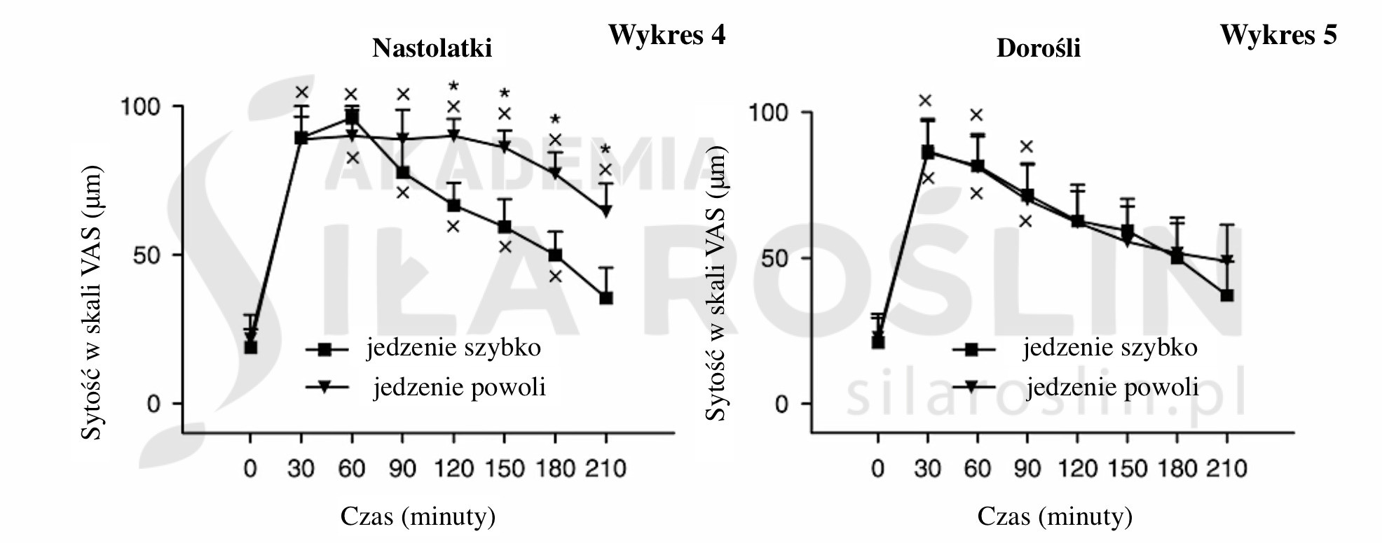 To samo z poposiłkowym uczuciem sytości [4]. Otyli nastolatkowie czuli się bardziej najedzeni i syci na dłużej, gdy jedli wolniej (Wykres 4), ale u otyłych dorosłych szybkość spożywania posiłku nie zrobiła już praktycznie żadnej różnicy (Wykres 5) [4].