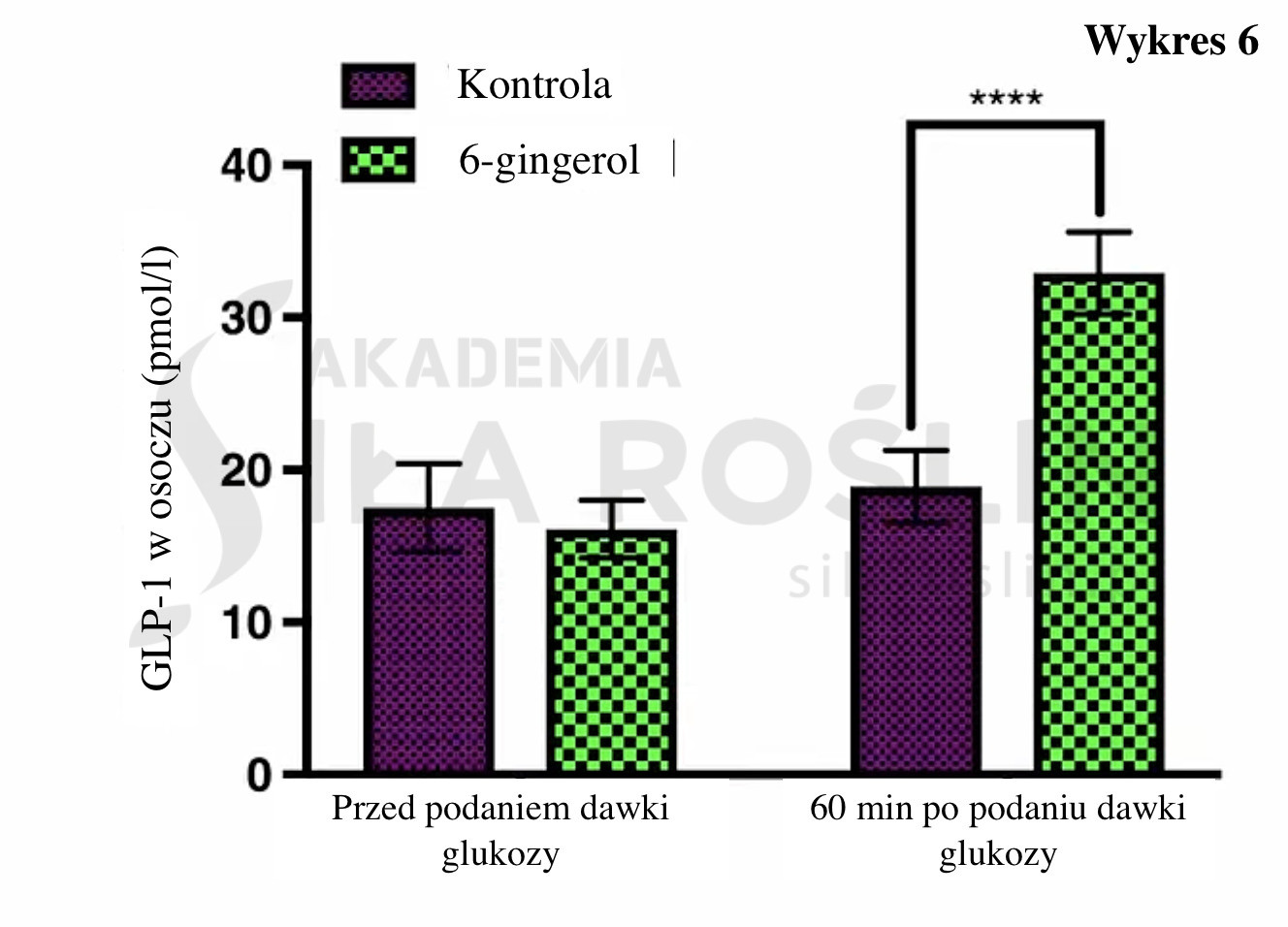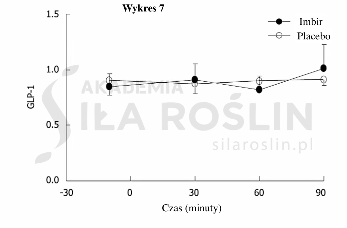 Jeśli chodzi o badania z udziałem ludzi, wyniki były niestety rozczarowujące: imbir nie przełożył się na wzrost poziomu GLP-1 we krwi w stosunku do placebo (Wykres 7) [8].