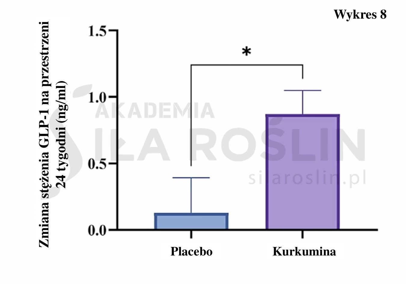 W badaniu w 2018 r. [10] kurkuminę zastosowano w dawce 180 mg, co odpowiada ilości zawartej w mniej więcej jednej łyżeczce kurkumy. Badacze testowali tutaj również suplementy na bazie oleju rybiego, ale okazały się one nieskuteczne [10]. Kurkumina natomiast zredukowała poposiłkowy skok poziomu cukru we krwi [10], co oznacza, że wywołała efekt charakterystyczny zarówno dla GLP-1, jak i leków go naśladujących. Co prawda w tym konkretnym przypadku nie mierzono bezpośrednio poziomu GLP-1, jednak naukowcy sugerują, że może to być mechanizm od niego zależny [10]. Kurkumina stymuluje bowiem produkcję tego hormonu zarówno u gryzoni [10], jak i u komórek na szalce Petriego [11]. Jeszcze do niedawna brakowało w tym obszarze badań na ludziach. Przełom nastąpił w 2024 r., kiedy to opublikowano wyniki 6-miesięcznej interwencji, w której suplementacja kurkuminą doprowadziła do czterokrotnego wzrostu poziomu GLP-1 w stosunku do placebo (Wykres 8) [12]. Wygląda więc na to, że kurkuma rzeczywiście może być pomocna.