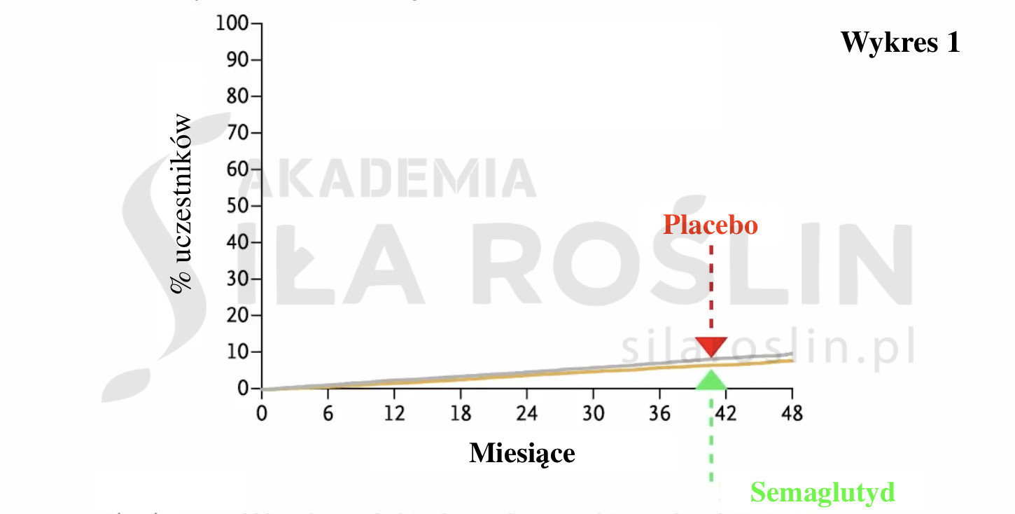 Nie zmienia to jednak faktu, że skuteczność przy współistniejących schorzeniach sercowo-naczyniowych to zdecydowanie dobra wiadomość, bo wiele osób z nadwagą ma za sobą zawał, udar lub cierpi na choroby naczyń obwodowych. O jakich dokładnie efektach tutaj mówimy? Na przestrzeni kilku lat odsetek osób, u których wystąpiło kolejne zdarzenie sercowo-naczyniowe wyniósł 8% w grupie placebo i 6,5% w grupie przyjmującej lek (Wykres 1) [6].