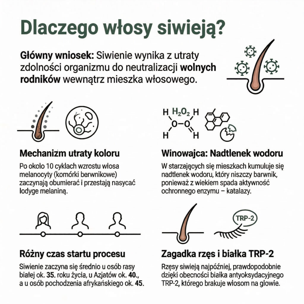 Istnieje zaburzenie pigmentacji zwane bielactwem (inaczej vitiligo), w przebiegu którego melanocyty w skórze są niszczone przez nagromadzony nadtlenek wodoru [12]. Związek ten rozkłada się bowiem do toksycznych wolnych rodników [12]. Naukowcy postanowili sprawdzić ten trop i rzeczywiście potwierdzili, że w starzejących się mieszkach włosowych nadtlenek wodoru kumuluje się w stężeniach równie „ogromnych” co w skórze pacjentów cierpiących na bielactwo [12]. Skąd bierze się ten związek? Powstaje on naturalnie jako produkt uboczny syntezy melaniny [13], ale w normalnych warunkach jest neutralizowany przez enzym antyoksydacyjny zwany katalazą [14]. Problem polega na tym, że aktywność katalazy, i innych mechanizmów obrony przed stresem oksydacyjnym, spada wraz z wiekiem, pozostawiając melanocyty bezbronne wobec niszczycielskiego wpływu wolnych rodników [14].